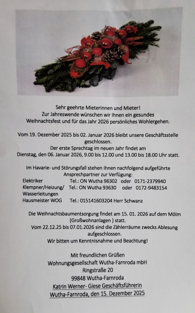 Sie können uns in unseren Geschäftsräumen zu unseren Geschäftszeiten aufsuchen und alle Ihre Fragen rund um das Thema Wohnen in Wutha-Farnroda stellen. Unsere motivierten Mitarbeiter suchen gemeinsam mit Ihnen Lösungen.
